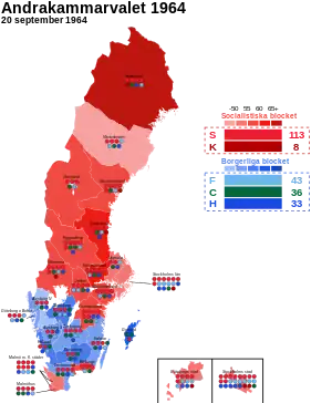 General elections were held in Sweden on 20 September 1964.[1] The Swedish Social Democratic Party remained the largest party, winning 113 of the 233 seats in the Andra kammaren of the Riksdag.[2] Tage Erlander's Social Democratic government was returned to power.