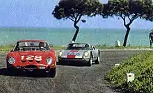 The Ferrari 250 GTO #128 of Nicolosi/Zanardelli pursued by the Porsche 904/8 #186 of Barth/Maglioli. They ended 13th and 6th, respectively