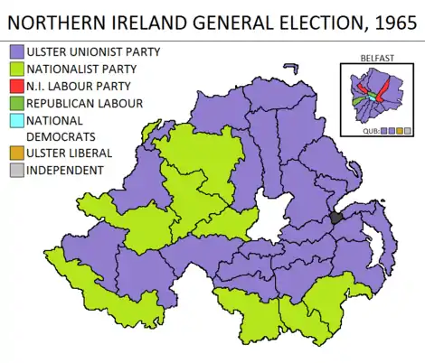 The 1965 Northern Ireland general election was held on 25 November 1965. Like all previous elections to the Parliament of Northern Ireland, it produced a large majority for the Ulster Unionist Party. This was the last election in Northern Ireland in which one party won a majority of the vote. The Ulster Unionists increased their vote share largely due to a reduction in the number of uncontested seats, but also picked up two additional seats. Similarly, the Nationalist vote share decreased largely due to more of the seats in which they stood candidates being contested.