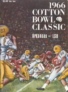 The 1966 Cotton Bowl Classic was a post-season college football bowl game of the 1965 season with national championship implications[1] between the Southwest Conference champion Arkansas Razorbacks[2] and the LSU Tigers of the Southeastern Conference. With a scoreless second half at the Cotton Bowl in Dallas, LSU defeated Arkansas 14–7 in front of 76,200 spectators on Saturday, January 1, 1966.[3][4][5][6]