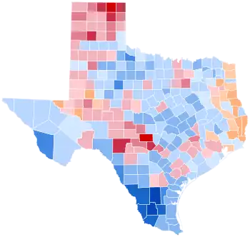 With his win in the Lone Star State, Texas was the only former Confederate State in 1968 to vote Democratic. As of the 2020 presidential election, this is the last occasion the following counties have supported the Democratic candidate: Blanco, Nacogdoches, Rockwall and Scurry.[13] The 1968 election is also the last when the following Wallace counties have not voted Republican: Crane, Glasscock, Montgomery and Rusk.[13] It was the only election between 1924 and 2012 when Val Verde County backed a losing presidential candidate.[14]