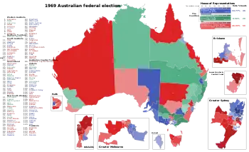 The 1969 Australian federal election was held in Australia on 25 October 1969. The incumbent Liberal–Country coalition government, led by Prime Minister John Gorton, won the election with a severely diminished majority over the opposition Labor Party, led by Gough Whitlam despite losing the two party popular vote. Both major parties had changed their leaders in the run-up to the election, the first time this had occurred since 1946. The victory was the ninth consecutive general election won by the Coalition, and remains the record number of consecutive terms won by any Australian Federal Government.