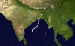 A low-pressure area developed in the northern Bay of Bengal on June 6 and developed into a depression on the next day, as it drifted to the north, moving over the south of the Ganges Delta. The depression reversed its course overland, reemerging into the Bay of Bengal on June 8. Once over open water, the depression intensified into a cyclonic storm on the morning of June 9. The cyclone's motion shifted to the northwest and it made a second landfall near Balasore in northern Orissa that night. The cyclone quickly weakened to a deep depression overland and tracked to the west over central India, where it degenerated into a broad area of low pressure on June 11.[2] Sustained winds of 65 km/h (40 mph) were recorded at Sandheads on June 9, while the cyclone was at its peak offshore. High levels of rain affected much of Orissa and West Bengal, with over 100 mm (3.9 in) falling over large areas of both states. As the storm dissipated overland, it brought severe rain to Vidarbha and southern Madhya Pradesh. The highest recorded rainfall was at Khandwa were 280 mm (11 in) fell on June 13 alone. The rains led to localised flooding in parts of Vidarbha and disrupted road transport in the region.[2]