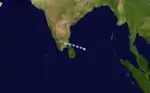The remnant low of a depression emerged into the Arabian Sea off Kerala late on November 21, and developed into a new depression on the next day, as it moved westward. The depression moved further west, and gradually turned toward the southwest, intensifying as it did so. It became a cyclonic storm on November 28, to the southeast of Socotra, and reached its peak intensity with winds of 75 km/h (45 mph) soon after. The cyclone continued to move west-southwestward, and rapidly weakened into a remnant low-pressure area off the Somalia coast on the next day, ending the season.[2] The cyclone brought widespread rain to the Laccadives from November 22 to 24, with 60 mm (2.4 in) recorded on Amini on November 23.[2]