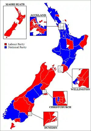 In the South Island, three electorates were abolished (Buller, Westland, and Selwyn), and three electorates were newly created (Rakaia, Tasman, and West Coast).[7] In the North Island, five electorates were abolished (Hauraki, Marsden, Otaki, Waimarino, and Waitomo), two electorates were recreated (Coromandel and Otahuhu), and six electorates were newly created (East Coast Bays, Hamilton East, Kapiti, King Country, Ruahine, and Whangarei).[8]