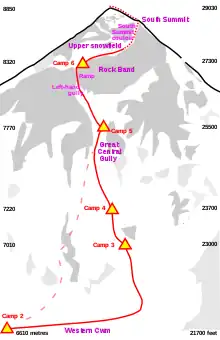 Using binoculars, the main party at Camp 2 were just able to see the two climbers on the upper snowfield before they disappeared into a couloir leading up to the South Summit. They were then briefly spotted at the top of the couloir, at 16:00 much later than expected, still moving upwards before it got dark. As dawn broke the next day they could be seen moving back to Camp 6.[53][54] By this time the second party had already set off from Camp 5, not knowing whether the first party had reached the summit and whether they would have to perform a rescue mission.[55][56]