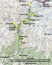 The main team flew from London to Kathmandu from where in early August they travelled by road to Lamosanghu (near Pagretar).[note 6] From there on they travelled as two parties trekking separately.[33] Despite the trek taking place during the monsoon, in the mornings the weather was fine but with afternoon rain. Estcourt and Haston went ahead to prepare a route on the Icefall.[34][note 7] Bonington's party reached Khunde on 14 August after a two-week trek and at Thyangboche they met the lama to receive his blessing.[36]
