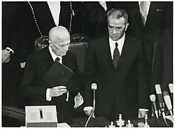 Sandro Pertini taking the oath in front of the Parliament near the President of the Chamber of Deputies Pietro Ingrao on 9 July 1978