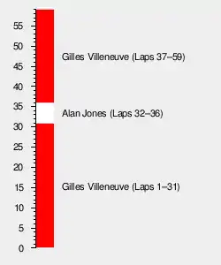 Villeneuve now led Scheckter by almost a lap. Arnoux lost two positions, to fifth, when he pitted for tires, but regained third place, ahead of Daly and Pironi, in two laps. On lap 48, Scheckter felt his car floating about and thought he had a puncture. He decided to go one more lap, but never made it back. The tire shredded and he retired, leaving only nine cars still running. Daly spun off from fourth, and Piquet, after setting fastest lap of the race in pursuit of John Watson's McLaren, dropped out with a broken driveshaft five laps from the flag.