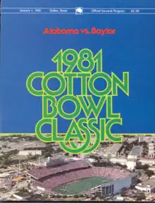 The 1981 Cotton Bowl Classic was the 45th edition of the college football bowl game, played at the Cotton Bowl in Dallas, Texas, on Thursday, January 1. Part of the 1980–81 bowl game season, it matched the ninth-ranked Alabama Crimson Tide of the Southeastern Conference (SEC) and the #6 Baylor Bears of the Southwest Conference (SWC). Favored Alabama shut out the Baylor offense and won, 30–2.[2][3][4]