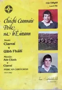 Kerry and Offaly had met in the 1980 semi-final and the 1981 final, Kerry emerging as victors on both occasions.[2] Indeed, Kerry had not lost a championship game since the 1977 semi-final.[2] However, this time, a last-minute Séamus Darby goal — struck past the hapless Charlie Nelligan — deprived Kerry of their five-in-a-row dream.[3] They had to put away their "Five in a Row" song, which had been prepared especially for the occasion.[4]