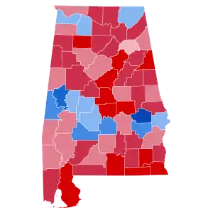 Reagan easily carried Alabama on Election Day, winning the state by a 22-point margin, a dramatic shift from 1980, when Reagan had won it by just 1.3% over Southerner Jimmy Carter. This was only the third time that the Republican nominee exceeded 60% of the vote in the Yellowhammer State, after Barry Goldwater in 1964 and Richard Nixon in 1972. Mondale carried most of Alabama's Black Belt counties, but outside these predominantly African-American counties, he carried only Colbert, Lawrence, and Jackson Counties, which lay within the region served by the Tennessee Valley Authority (Colbert is home to Muscle Shoals). Overwhelmingly, the state's 'Wallace country' went red this election, unlike in 1976 or even 1980.[2] As an example, Reagan claimed over 2/3 of the vote in Coffee County, which had voted for Carter in 1976 by over 20% and had voted for Reagan in 1980 by just 4.7%.[2]