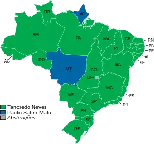 | Tancredo Neves | José Sarney | Brazilian Democratic Movement Party | 480 | 72.73 | |