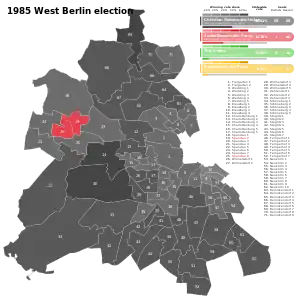 The 1985 West Berlin state election was held on 10 March 1985.[1] Eberhard Diepgen was the CDU's lead candidate and would later be unanimously elected as the mayor of West Berlin.[2]