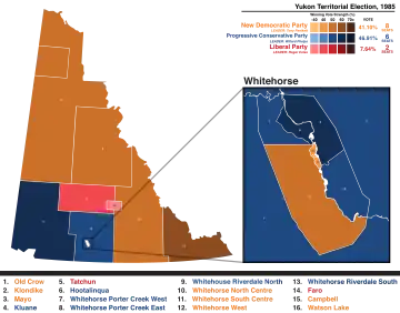 The 1985 Yukon general election was held on May 13, 1985 to elect members of the 26th Legislative Assembly of the territory of Yukon, Canada. It was the first Yukon general election with live results coverage on television, and was suspenseful as telecommunications problems prevented the results of the Old Crow riding from being known outside of that community. It was won by the New Democratic Party.