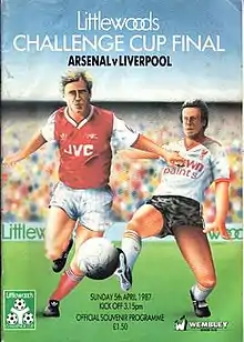 The 1987 Football League Cup Final was a football match played on 5 April 1987 between Arsenal and Liverpool. The match, played in front of 96,000 spectators at Wembley Stadium, was won by Arsenal 2–1. Ian Rush opened the scoring for Liverpool with a side foot finish to the corner of the net, before Charlie Nicholas equalised, turning in a cross from the right in a crowded penalty area. Nicholas was credited with scoring the winning goal in the second half from a Perry Groves cross. His off-target shot deflected off Ronnie Whelan and was diverted past Liverpool goalkeeper Bruce Grobbelaar's outstretched hand and into the left corner of the net.