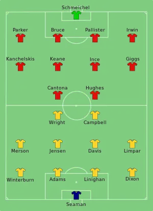 Arsenal lined up in a 4–4–2 formation; Eddie McGoldrick was included in the matchday squad, while Kevin Campbell partnered Ian Wright up front.[17] Ferguson deployed a 4–2–4 formation, with Paul Ince partnering debutant Keane in the midfield two.[17] Andrei Kanchelskis was picked in favour of Lee Sharpe on the right wing.[18]