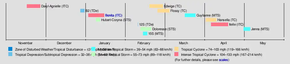 The 1995–96 South-West Indian Ocean cyclone season was a moderately active season that included Cyclone Bonita, which was the first known tropical cyclone to cross from the southern Indian Ocean into the southern Atlantic Ocean. Tropical activity lasted for about six months from the middle of November 1995 to early May 1996. The first storm, Intense Tropical Cyclone Agnielle, formed in the adjacent Australian basin on November 16 and later reached peak winds in the south-west Indian Ocean. The next named storm after Agnielle was Bonita, which formed in early January and killed 42 people. The basin was most active in February, with two tropical cyclones, or the equivalent of a minimal hurricane, as well as a severe tropical storm. The first of these three was Doloresse, which killed 67 people due to a shipwreck in the Comoros. The next storm was Cyclone Edwige, which caused heavy crop damage on Mauritius before looping along the east coast of Madagascar. In March, both Cyclone Flossy and Tropical Storm Guylianne passed near the Mascarene Islands, producing heavy rainfall and gusty winds.