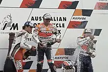Daryl Beattie, Mick Doohan and Àlex Crivillé, spraying the champagne on the podium after finishing second, first and third at the 500cc race.