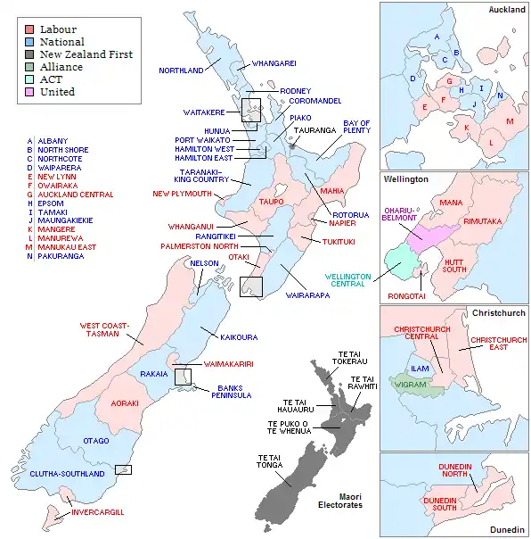 Various other unusual results occurred under the new system. For one, the National Party sought to ensure the parliamentary representation of the ACT New Zealand, a newly-formed libertarian party which had largely split from the Labour Party after the end of Rogernomics. National endorsed ACT leader and former Labour minister Richard Prebble against their own for Wellington Central, a consistently safe Labour seat. Under New Zealand's MMP rules, a party qualified for list seats if it won at least one electorate seat, regardless of vote share. Bolger thus wanted to ensure ACT could potentially be part of a National-led coalition. Prebble unexpectedly won, though ACT's vote share would have qualified them for MMP in any event. Other unusual occurrences was the large amount of new Māori MPs – leading to the backronym "More Māori in Parliament" for MMP.[1] With the introduction of MMP in 1996, the proportion of Māori in Parliament increased from 8% to 14%, to an all-time record of 17 MPs.[2]