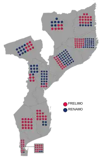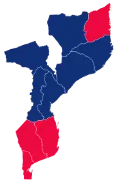 Presidential election results map. Red denotes provinces won by Chissano, and Blue denotes those won by Dhlakama.