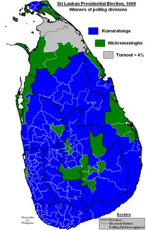 ![]() Winners of polling divisions. Kumaratunga in blue and Wickremasinghe in green. | ||||||||||||||||||||
