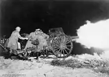 The 1st Field Regiment was formed in 1914 following the outbreak of World War I, designated as the "1st Field Artillery Brigade".[1] The brigade saw action on the Gallipoli Peninsula in 1915, supporting the British 29th Division around Cape Helles from early May, and then the Australian 2nd Division around Anzac Cove from October until the force was withdrawn back to Egypt. From mid-1916, the brigade supported the 1st Division on the Western Front until the end of the war in November 1918.[2] During this time, the regiment consisted of the following: the 1st Field Artillery Battery, 2nd Field Artillery Battery, 3rd Field Artillery Battery, 101st Field Artillery (Howitzer) Battery and the 1st Brigade Ammunition Column.[3]