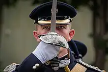 Full dress is still worn by some on ceremonial occasions:[21] the 1st King's Dragoon Guards tunic (scarlet with blue velvet facings) being paired with Queen's Bays white-striped overalls. The KDG red-plumed brass cavalry helmet is also worn, together with pouch belts and other accoutrements.[22]