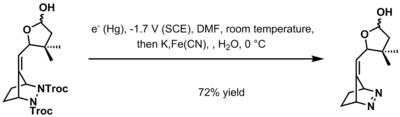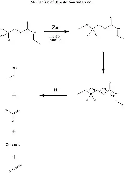 The troc group is traditionally removed via Zn insertion in the presence of acetic acid, resulting in elimination and decarboxylation.