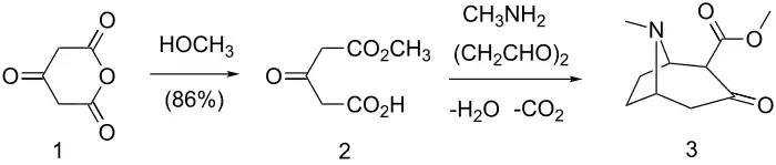 2-CMT (3) can be synthesized from 1,3-acetonedicarboxylate anhydride (1) by methanolysis followed by reaction with methylamine and succinaldehyde.[8]