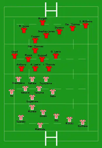 Despite his yellow card in the midweek match against the Pacific Barbarians, Chris Stephens was named on the bench for the second test against Japan. In the starting line-up, Wales made two changes from the first test; Tom Shanklin was named on the wing to make his test debut in place of the injured Mark Jones, while Nathan Budgett was named in the back row in place of Andy Lloyd.[28] Wales held a 19–3 lead after half an hour, thanks to a try from Gavin Thomas and two from Gareth Thomas, but two quick tries and a penalty for Japan put the home side 20–19 up at half-time. After the break, Wales scored four tries in the first 20 minutes; Gavin Thomas opened the scoring with his second try of the game, before Shane Williams scored his seventh try of the tour, followed by two in two minutes from debutant Shanklin. Scrum-half Dwayne Peel came on to make his test debut in the 73rd minute, shortly before Gareth Thomas completed his hat-trick. Following a consolation score from Hirotoki Onozawa, fellow substitute Jamie Robinson scored another try with the final play of the game, giving Wales a 53–30 win and a 2–0 victory in the test series.[29]
