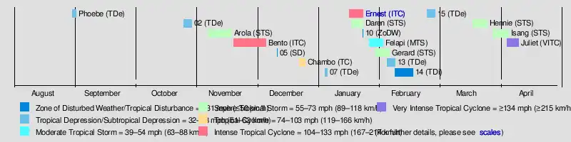 Météo-France's meteorological office in Réunion (MFR) is the official Regional Specialized Meteorological Center for the South-West Indian Ocean, tracking all tropical cyclones from the east coast of Africa to 90° E.[1] The agency tracked 18 tropical disturbances, including one zone of disturbed weather that lasted for one advisory, which was higher than normal. The agency assessed that 15 disturbances reached tropical depression intensity.[2][3] Ten of these weather systems intensified into named storms, which was one higher than normal. There were 44 days in which a named storm was active, lower than the average of 53. There was an unusual period of inactivity across much of the basin from January to March, typically the most active months. During this time, the Intertropical Convergence Zone was located farther south than usual, causing any developing storms to reach their peak intensity at higher latitudes. The exception was southern Madagascar, which was affected by Cyclone Ernest and Tropical Storm Felapi in a five-day span in late January. Four of the named storms attained maximum sustained winds of at least 120 km/h (75 mph), the threshold for tropical cyclone intensity; this was also near normal. Three tropical cyclones strengthened into intense tropical cyclones, including Very Intense Tropical Cyclone Juliet.[2]