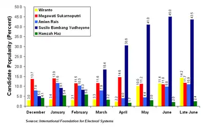 In December 2003, the International Foundation for Electoral Systems (IFES) began a tracking survey in order to assess the popularity of potential candidates. The survey continued until the start of the first election round on 5 July and included thirteen possible candidates for president. The first IFES survey indicated that incumbent President Megawati Sukarnoputri received a plurality of the votes. However, by the time of the April 2004 legislative election, retired General Susilo Bambang Yudhoyono had taken the lead from Megawati after resigning from her cabinet in March. Other potential candidates included DPR Speaker Akbar Tanjung and Yogyakarta Sultan Hamengkubuwana X.[7]