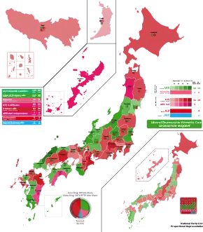 | Liberal Democratic Party | 16,797,686 | 30.03 | 15 | 19,687,954 | 35.09 | 34 | 66 | 49 | 115 | +5 | ||