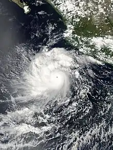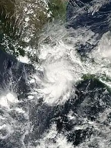 A tropical wave entered the eastern Pacific in mid-October, interacting with two previous tropical waves that resulted in a large area of disturbed weather. The system organized into a tropical depression at 00:00 UTC on October 25 about 315 miles (507 km) south-southeast of the Baja California Peninsula. Initially, the cyclone was characterized by a large area of deep convection enhanced from an upper-level trough. This same trough soon imparted strong wind shear, preventing intensification. The depression moved into Sinaloa early that same day and dissipated over the Sierra Madre Occidental at 18:00 UTC on October 26.[44]