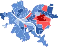 The general election was held on November 6, 2007, in unusually cold and windy weather which included the city's first snowfall of the year.[6] Voter turnout was estimated to be 28.98%, and very few problems were reported at the polls.[7][8] DeSantis polled well in more affluent areas of the city, such as Squirrel Hill, while Ravenstahl commanded large portions of the vote in the city's black and working class white neighborhoods, such as the Hill District. The race was more competitive than usual in the heavily Democratic city, but was sufficiently one-sided that the Associated Press declared Ravenstahl to be victorious only slightly more than one and a half hours after the polls had closed and only 20% of city precincts had reported voting totals.[9] DeSantis conceded defeat to Ravenstahl shortly after, around 10 PM local time. Despite losing by more than thirty percentage points in general polling, DeSantis's performance was considered quite good for a Republican candidate, indeed the best performance in several decades.[2]