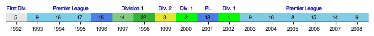 Prior to this season, the history of Manchester City's performance in the English football league hierarchy since the creation of the Premier League in 1992 is summarised by the following timeline chart – which commences with the last season (1991–92) of the old Football League First Division (from which the Premier League was formed).