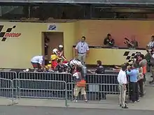After the solidication of the standings, Rossi still talks to Italian television as the others prepare themselves for the upcoming podium ceremony. By now, the remaining 250cc race - which was scheduled to run after this one - was cancelled due to the strong winds, making racing too dangerous.