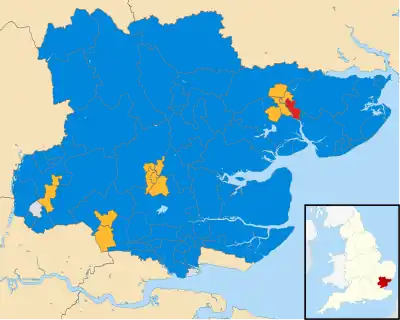 ![]() Results by electoral division.Conservatives in blue, Liberal Democrats in yellow, Labour in red and in grey the Canvey Island Independent Party and Independent Loughton Residents Association. | ||||||||||||||||||||||||||||||||||||||||||||||||||||||||||||||||||||||||||||||||||||||||||||||||||||||||||||