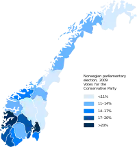 In the previous election, the Conservatives had their worst result since the Second World War, only obtaining 14.1% of the vote.[27] According to various opinion polls, most notably by Norstat, they had several weak showings from May to July 2009,[14] in what Verdens Gang described as the "summer nightmare". After this, In Fact, an opinion poll service, announced that the Conservatives had scored 15% in their poll.[28]