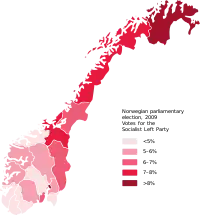 Facing a steady decrease in support since they joined the Red-Green Coalition, the Socialist Left Party faced the prospect of one of their worst elections since the 1980s. In the 2007 local elections, their result was halved from that of the previous local elections held in 2003.[34] By May 2009, the Socialist Left was the only party in the Red-Green Coalition whose public support increased—they averaged about 11.1% in an opinion poll.[35]