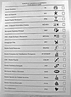 - ↑ Portuguese Communist Party (13 MPs) and "The Greens" (2 MPs).