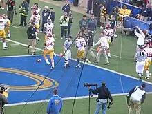 UCLA–USC rivalry game for the Victory Bell, which the Trojans retained by defeating the Bruins 28–7. Both teams wore home jerseys, in a tradition that was restarted the previous year, with the Bruins wearing their 1966 throwback powder blue jerseys. The final two minutes of the game proved to be interesting. With the Trojans leading 21–7 after a touchdown with 1:30 in the fourth quarter, and having possession of the ball after UCLA turned it over on downs, Carroll instructed his quarterback to take a knee. Rick Neuheisel then called a timeout to stop the clock. On second down, the Trojans immediately connected on a 48-yard pass play for their fourth touchdown of the game.[14] USC beat UCLA for the 10th time in 11 years, but the late touchdown pass stirred passions in the crosstown rivalry and lead to a benches-clearing incident.