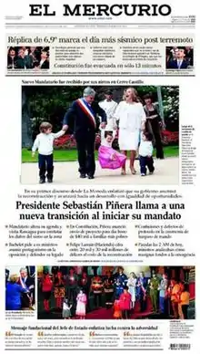 Nationally distributed newspaper El Mercurio published on its 12 March 2010 main page the headline "6.9 [magnitude] aftershock marks the most seismic day after the earthquake" ("Réplica de 6,9° marca el día más sísmico post terremoto"), adding that "[s]eventeen of the twenty seisms that occurred yesterday [11 March] in central-southern Chile had their epicentre in Pichilemu, Region of O'Higgins, which was declared in Disaster State yesterday."[68] On that same day, Santiago-based newspaper La Tercera published on their headline: "Piñera faces first crisis as he takes office as new President" ("Piñera enfrenta primera crisis al asumir como nuevo Presidente"); La Tercera elaborated: "The 6.9 Richter magnitude earthquake, which occurred minutes before the power handover took place, added an additional quota of drama to the oath of Sebastián Piñera, whose agenda was already modified by the 27 February disaster."[69] Other newspapers of national distribution where the earthquake was reported on its main page included Las Últimas Noticias (which featured a photograph of President Piñera aboarding a helicopter in military dress),[70] Publimetro,[71] and La Nación, whose main headline said "Emergency measures marked start of Piñera['s presidency]" ("Medidas de emergencia marcan partida de Piñera").[72]