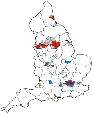 The elections that were due to be held in Exeter and Norwich were cancelled due to structural changes.[4][5] Following the 2010 general election, the structural changes were cancelled, leading to elections in both cities in September 2010 (see 2010 Exeter City Council election and 2010 Norwich City Council election).