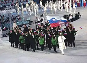 Of the flag-bearers who led their respective delegations, all but one were athletes, the exception being Fuad Guliyev, a skating official from Azerbaijan. The sport which was most represented among the flag-bearers was alpine skiing, as alpine skiers led 26 delegations. Only one delegation was led by a short track speed skater, Hong Kong, led by Han Yue Shueng.[1] Marjan Kalhor, an alpine skier and the flag-bearer for Iran, was both the first female flag bearer from her country and the first female athlete from her country to participate in the Winter Olympics.[2] It was erroneously pointed out by a Canadian TV commentator that Tomomi Okazaki was the first female flag bearer for Japan. This title goes to Seiko Hashimoto in Calgary 1988. Other prominent flag bearers included Canadian speed skater and five-time Olympian Clara Hughes, American luger Mark Grimmette, who had helped carry the American flag during the 2002 Winter Olympics, and Czech hockey player Jaromír Jágr. Hughes is the only Olympian ever to win multiple medals at both the Summer and Winter Olympics.[3]