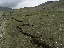 The earthquake occurred on the Yushu fault,[14] about 300 kilometres (186 mi) south of the Kunlun fault.[3] The Yushu fault forms part of the Yushu-Garzê-Xianshuihe fault zone (玉树-甘孜-鲜水河断裂带),[15] one of the most active fault zones in eastern Tibet.[16] In history, many earthquakes greater than magnitude 7 have occurred in the Xianshuihe fault zone,[15] for example, the magnitude 7.25 earthquake in the Luhuo area on March 24, 1923, and the Ms 7.6 earthquake on February 6, 1973, in Luhuo.[17] Almost all sections of the Xianshuihe fault zone have produced strong earthquakes in records, except the sections of Yushu and Shimian (石棉). However, a trace of a strong earthquake occurred about 16,000 or 17,000 years ago has been found in Shimian. Hence, the Shimian section of the Xianshuihe fault zone is speculated to be currently locked and have the possibility of producing a strong earthquake in the future.[15]