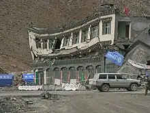 In Qinghai, building damage was reported with no casualties in the counties of Zadoi, Nangqên, and Qumarlêb of Yushu Prefecture.[20] At least 11 schools were destroyed in the earthquake.[21] Over 85% of buildings in Gyegu, mostly of wood-earth construction, were destroyed, leaving hundreds trapped and thousands homeless.[9] A vocational school collapsed and trapped many students.[9] Power outage was also reported in Gyêgu.[22] Jiegu Town in Yushu suffered the greatest destruction; over 94 percent of buildings were destroyed; the maximum China seismic intensity of IX.[23]
