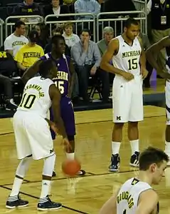 Before the season began, point guard Darius Morris, the Big Ten assists leader in the 2010–11 season, left the team after being drafted by the Los Angeles Lakers.[5] The incoming class included Carlton Brundidge and 2011 Ohio Mr. Basketball point guard Trey Burke.[6][7][8] Both Brundidge and Burke were among Scout.com's top 100 players of the 2011 class; Brundidge ranked 98th and Burke ranked 94th.[9] Max Bielfeldt committed to Michigan in April despite his family's ties to the Illinois Fighting Illini. Illinois University's Bielfeldt Athletic Administration Building was endowed by his family.[10][11] Sai Tummala, who along with Bielfeldt was recruited by Ivy League schools, rounded out the incoming class. Tummala earned an academic scholarship and was considered a walk-on candidate for the basketball team.[12]