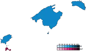 Voting for the Parliament was on the basis of universal suffrage, which comprised all nationals over 18 years of age, registered in the Balearic Islands and in full enjoyment of their political rights. Amendments to the electoral law in 2011 required for Balearic people abroad to apply for voting before being permitted to vote, a system known as "begged" or expat vote (Spanish: Voto rogado).[2] The 59 members of the Parliament of the Balearic Islands were elected using the D'Hondt method and a closed list proportional representation, with an electoral threshold of five percent of valid votes—which included blank ballots—being applied in each constituency. Seats were allocated to constituencies, corresponding to the islands of Mallorca, Menorca, Ibiza and Formentera, with each being allocated a fixed number of seats: 33 for Mallorca, 13 for Menorca, 12 for Ibiza and 1 for Formentera.[1][3]